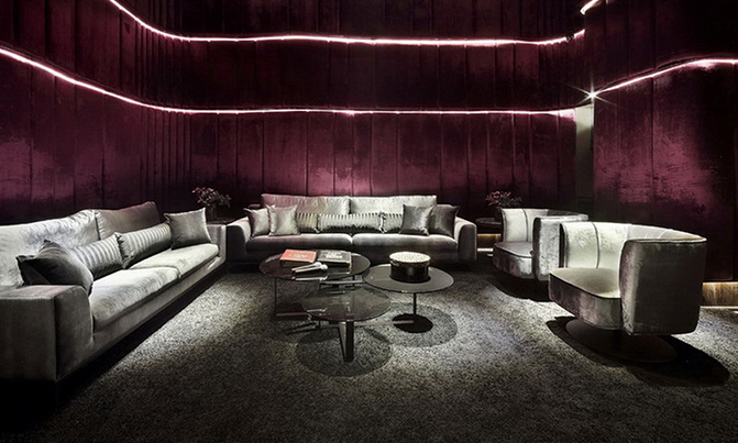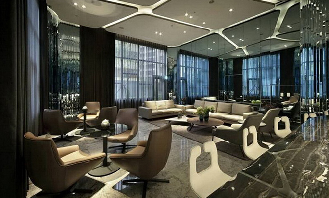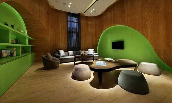 設計師用設計創造自然,運用綠色牆體塑造山丘意象,利用灰色椅凳與木質大茶几營造出石礫、樹木的生態感,整體公設採用多種材質,石材、金屬、木皮相互搭配,在空間裡增添舒適,奢華卻不失自然的趣味。