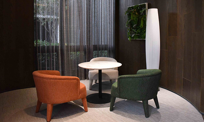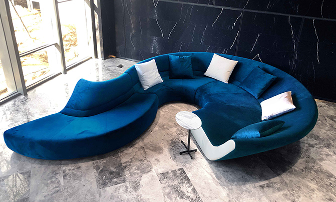 經設計師繪製的流線型沙發,以純手工打造的四件式組合而成,讓整體的線條輪廓,隨著沙發傾斜角度的變化,可坐可躺、凸線與凹線,創造出一個完美的空間雕塑。